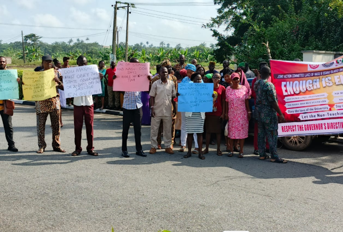 Tension rose on Tuesday at Olabisi Onabanjo University (OOU), Ago Iwoye, as members of the Joint Action Committee (JAC) of the Senior Staff Association of Nigerian Universities (SSANU) and the Non-Academic Staff Union of Educational and Associated Institutions (NASU) staged a protest over the cancellation of the two-day work-free period earlier approved by the Ogun State Government as a palliative measure.